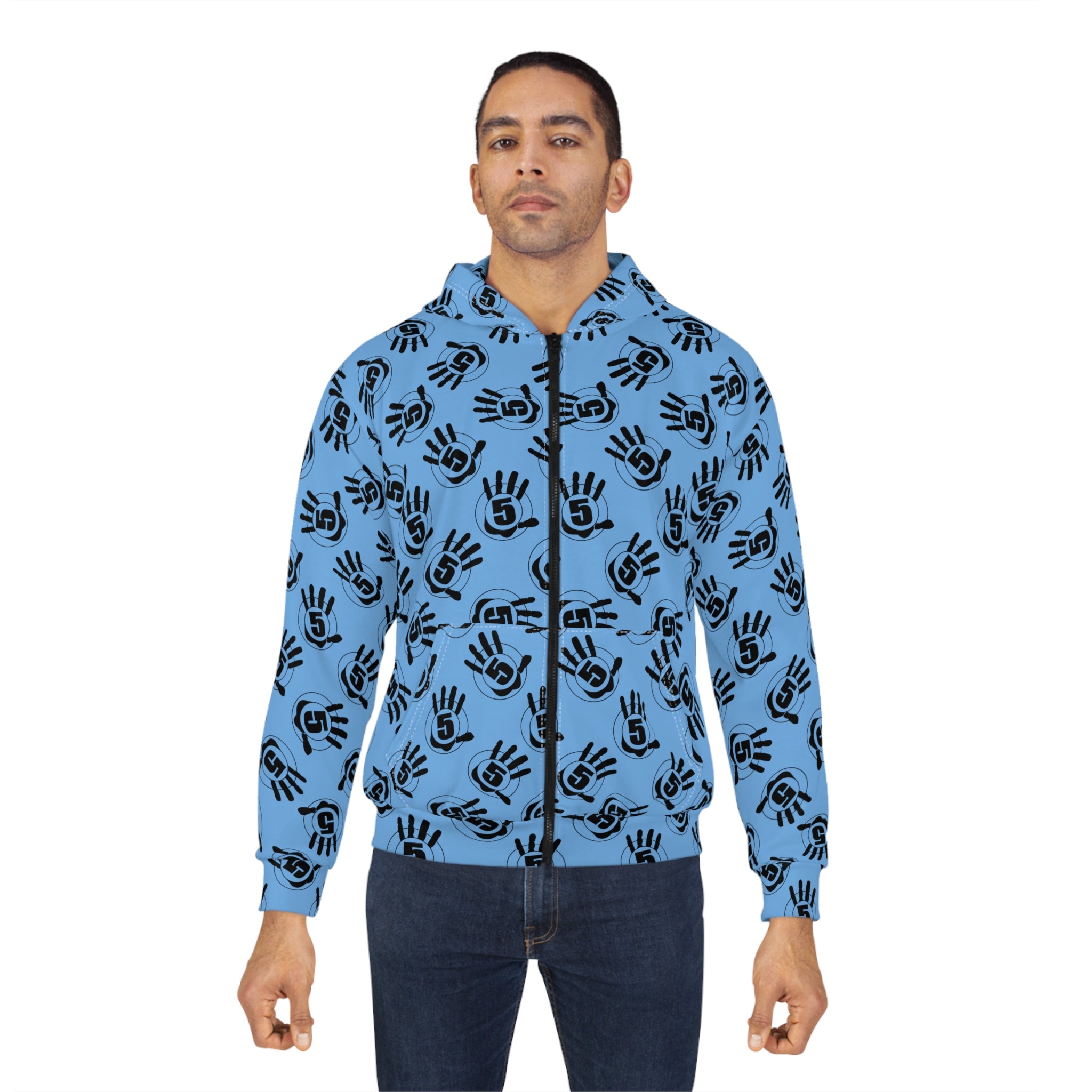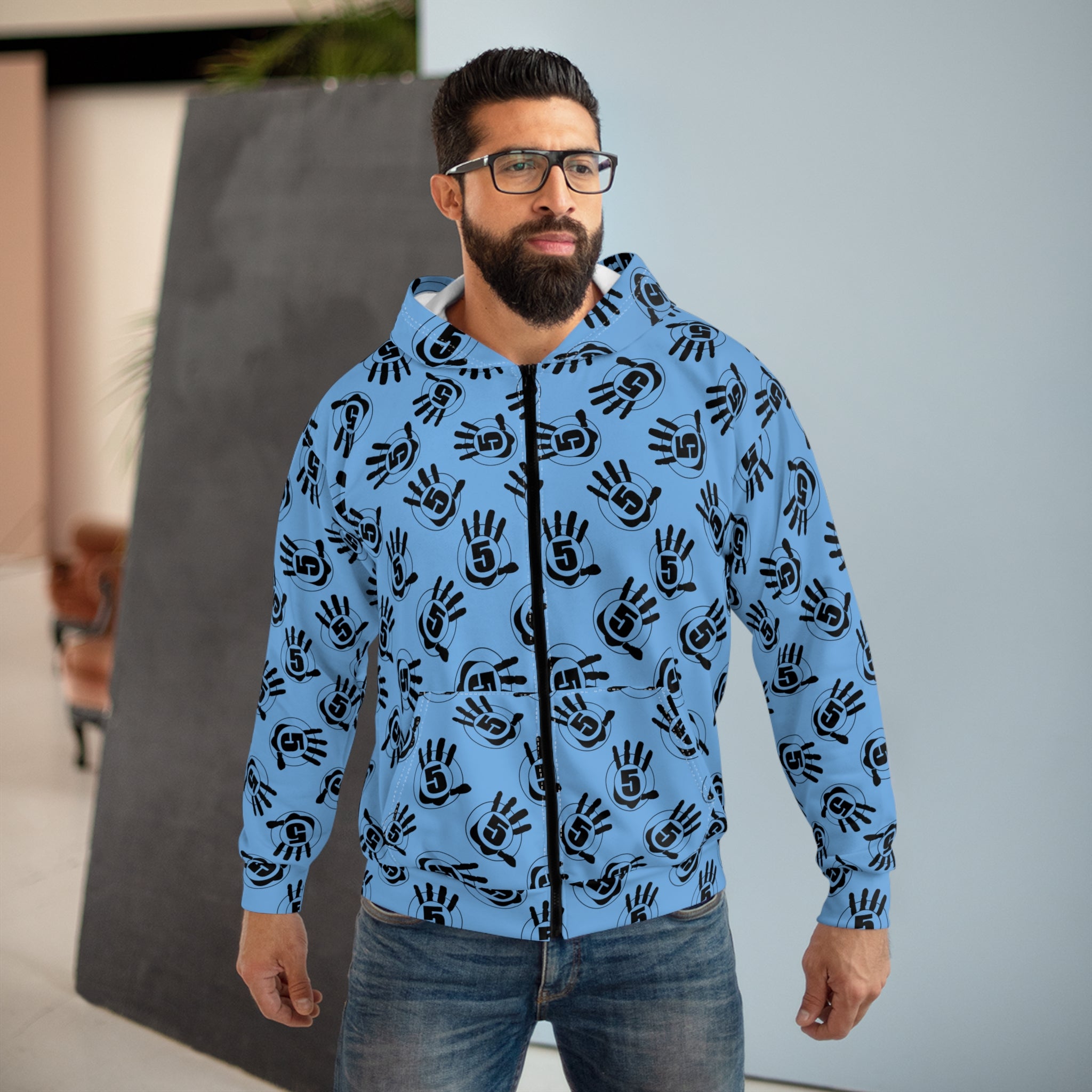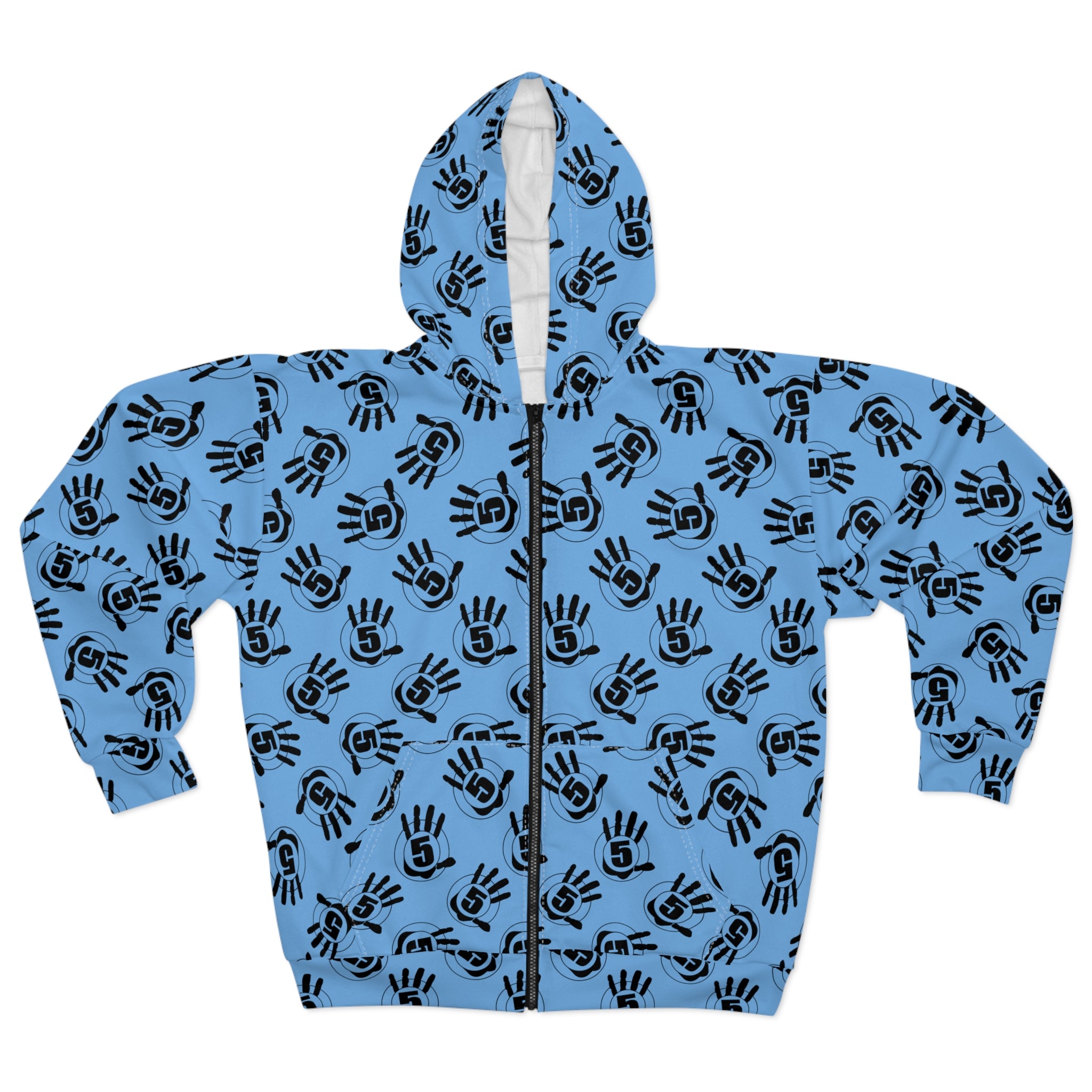 This all-over print zip hoodie feels like slipping into a familiar sketchbook of street art. Bold black handprint motifs repeat across a clean blue field, giving the piece a raw, graphic energy that reads like a personal emblem. The medium-weight polyester holds the print’s stark contrast and keeps the silhouette structured while staying comfortable for layering. Pockets at the front are roomy enough to warm your hands or stash small essentials. The black zipper and white stitching add subtle contrast details that keep the look intentional and slightly gritty. Wear it to wander city streets, back alleys, music nights, or to add an artful edge to everyday routines—this hoodie blends durable construction with a statement-making, wearable pattern.