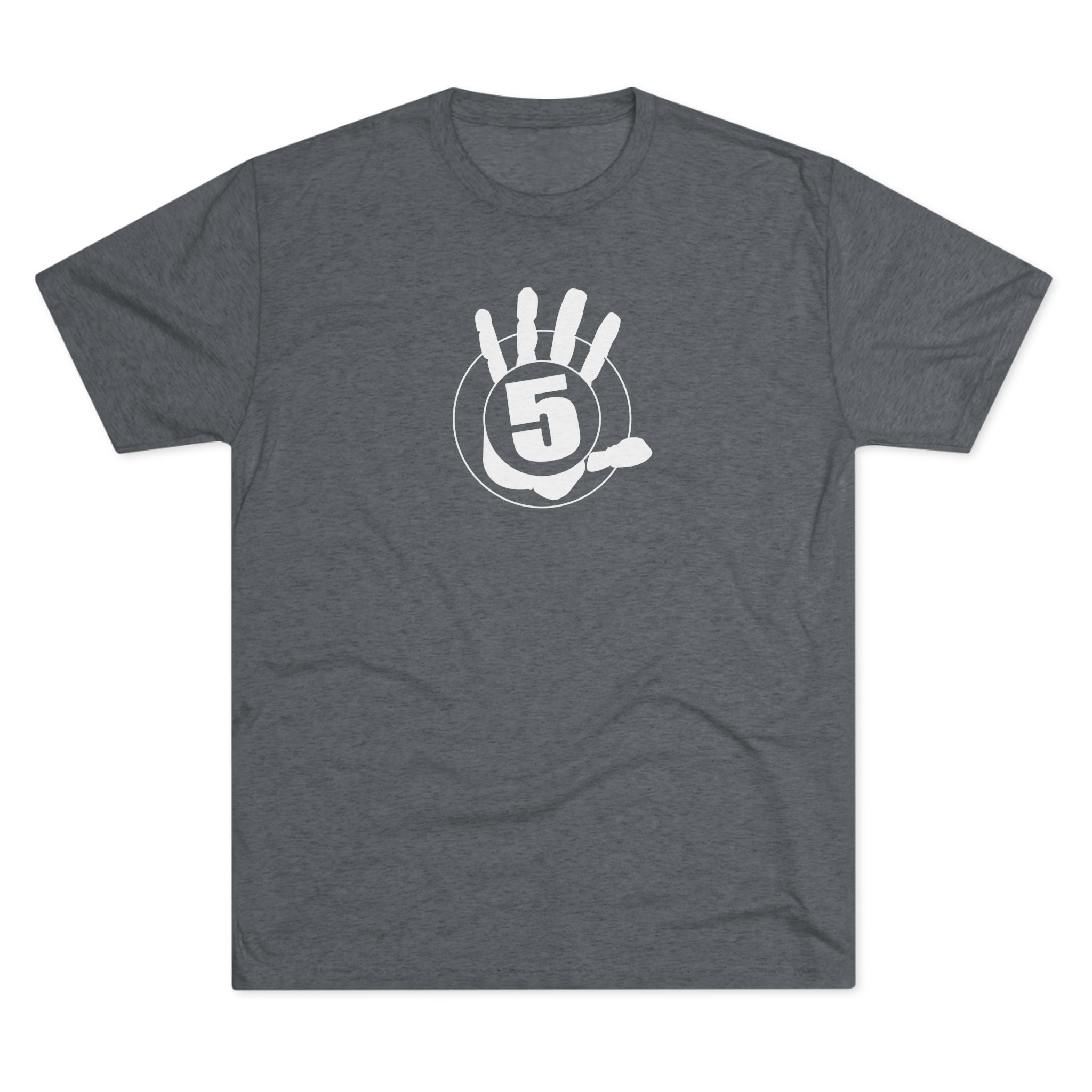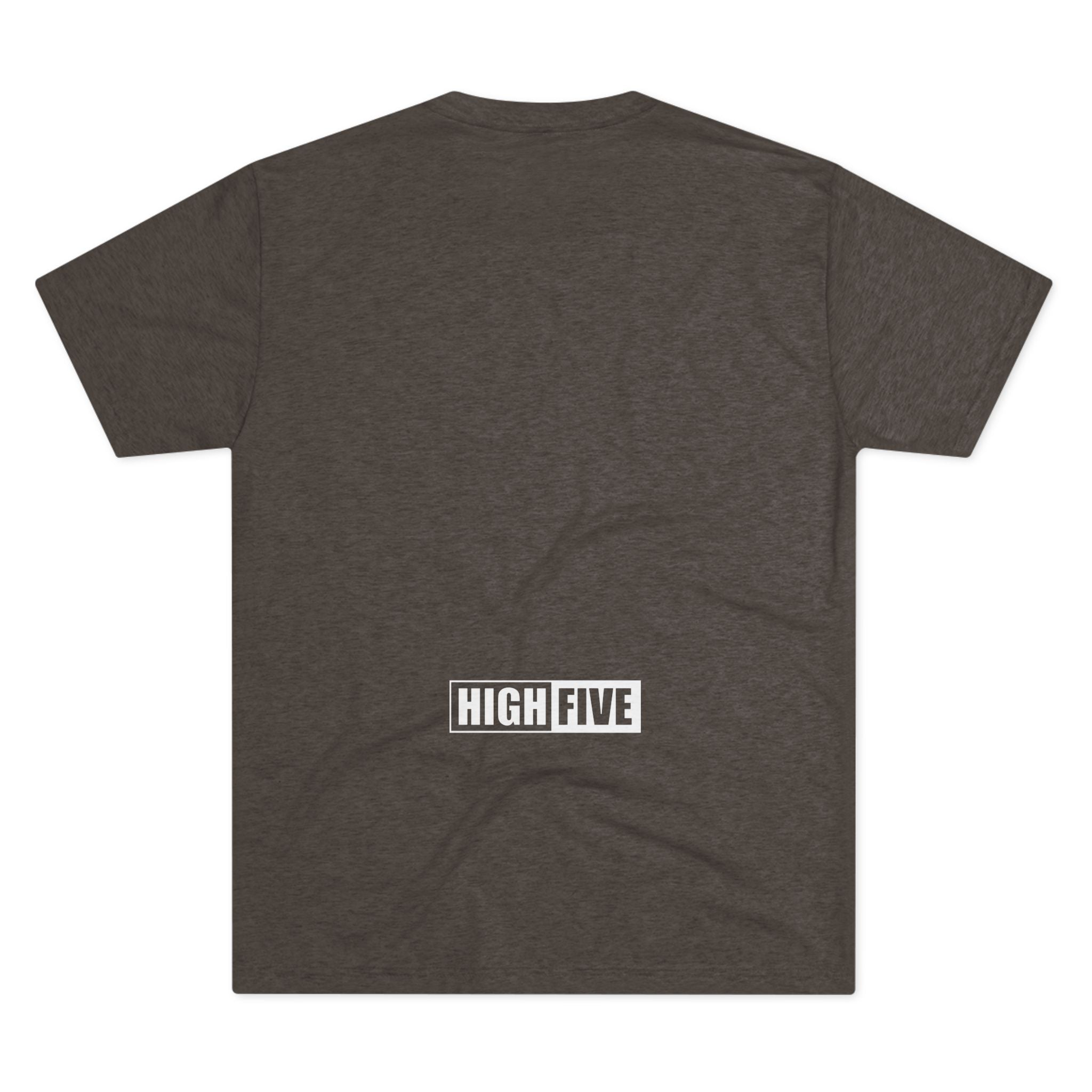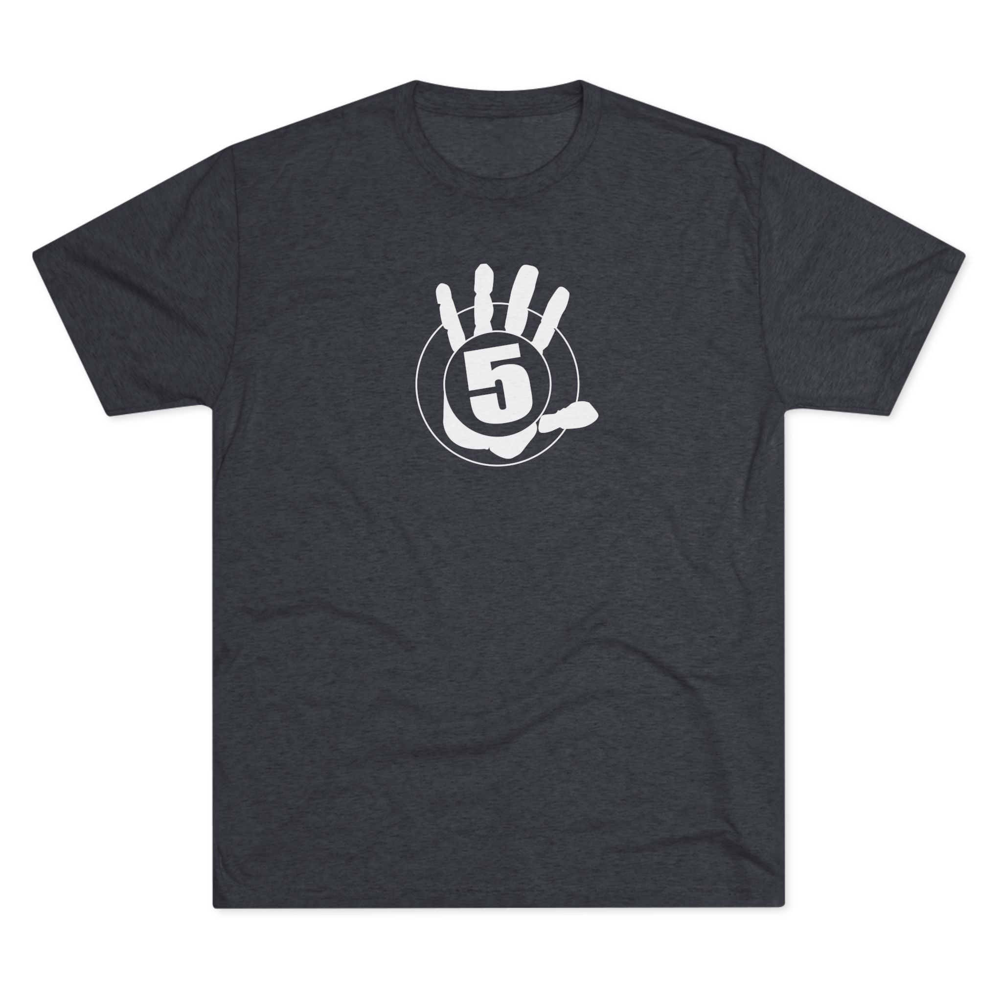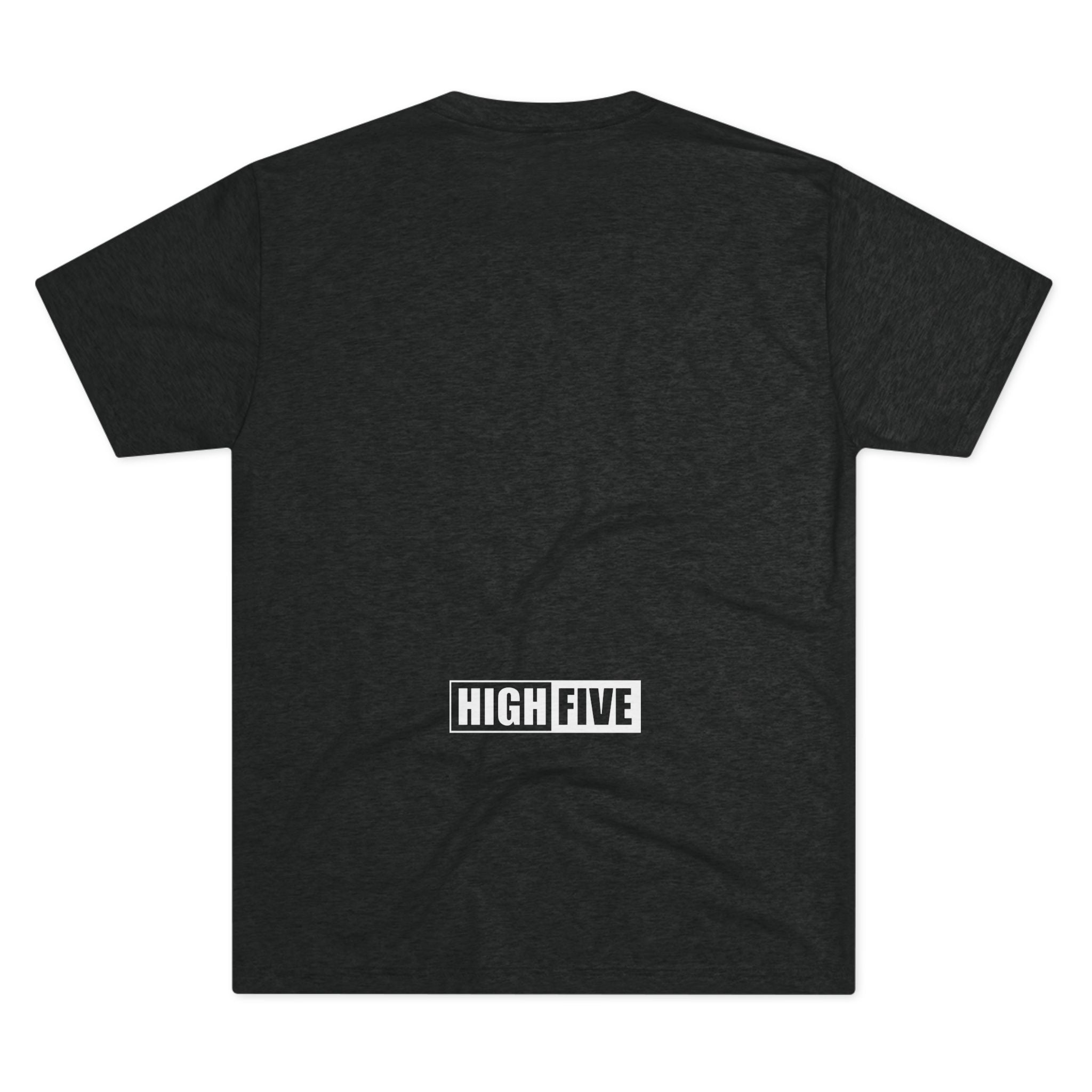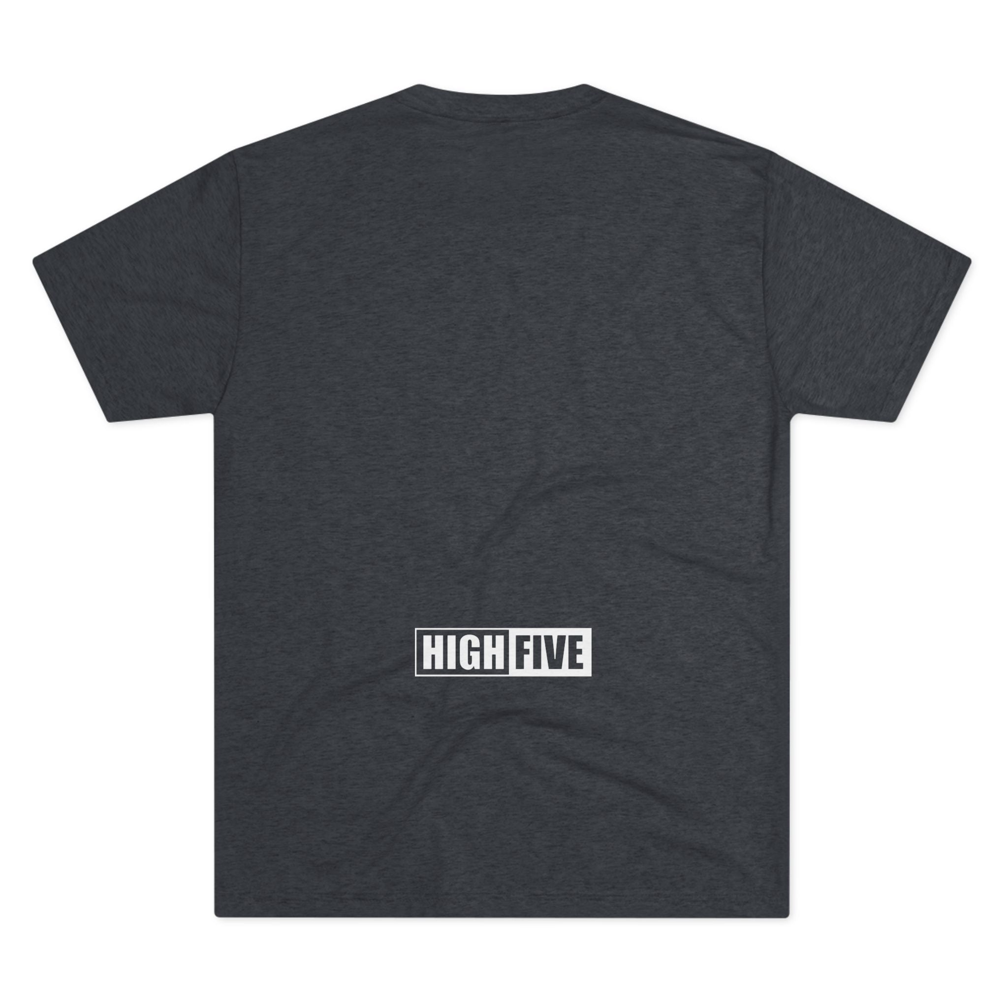 This lightweight crew tee carries a casual, confident energy — soft to the touch and built for everyday motion. A bold white “high five” emblem sits on the chest: an open palm with a centered circular badge and the number 5, clean and graphic. On the lower back a small boxed “HIGH FIVE” stamp adds a playful signature when you turn around. It drapes smoothly thanks to the tri-blend fabric, so it moves with you during quick errands, laid-back meetups, or long practice sessions. Wear it when you want to share a little upbeat attitude without shouting — the design reads friendly and retro-sporty, and the dark heather base keeps the focus on the bright white artwork. Comfortable, breathable, and subtly distinctive, this tee becomes one of those shirts you reach for whenever you want to look relaxed but intentional.