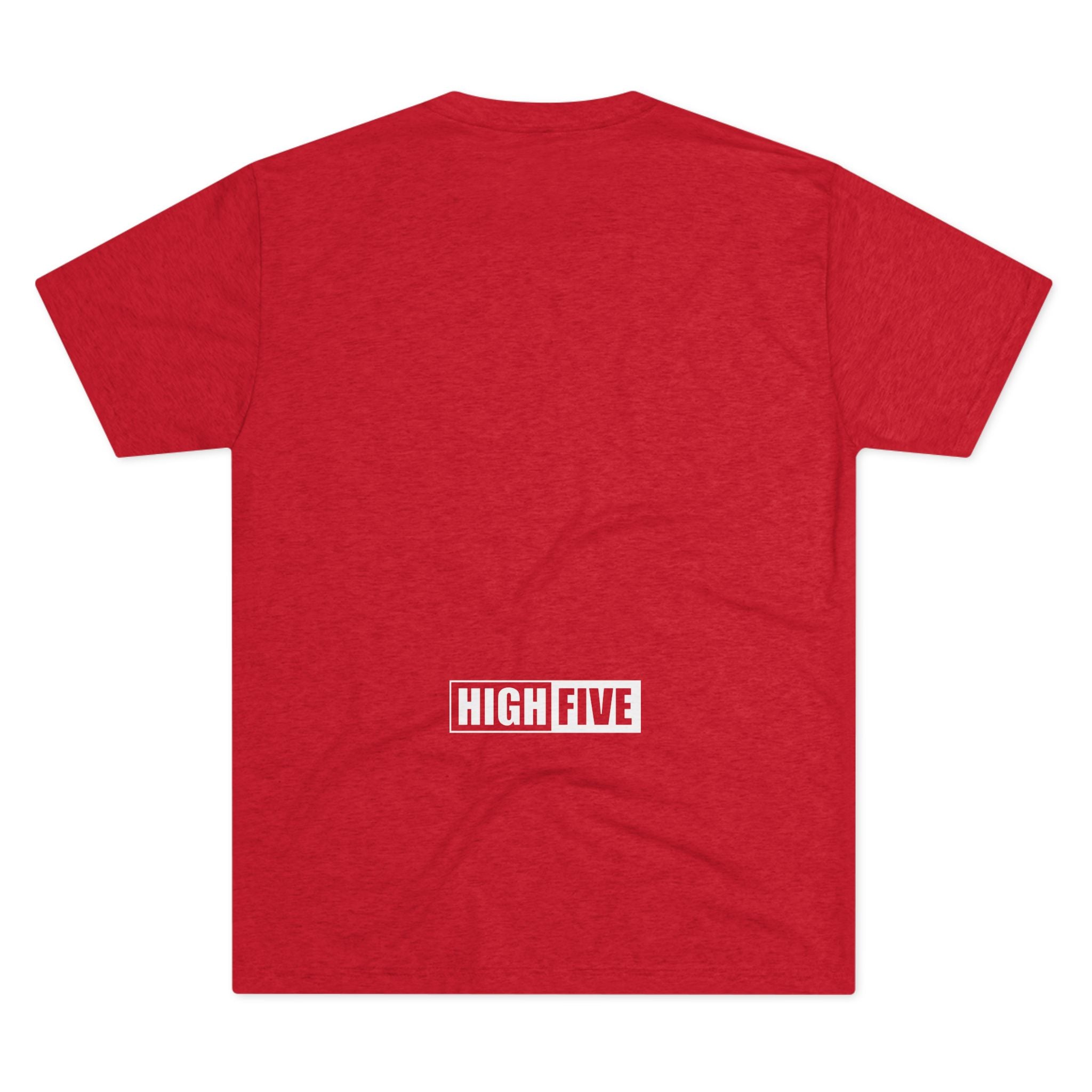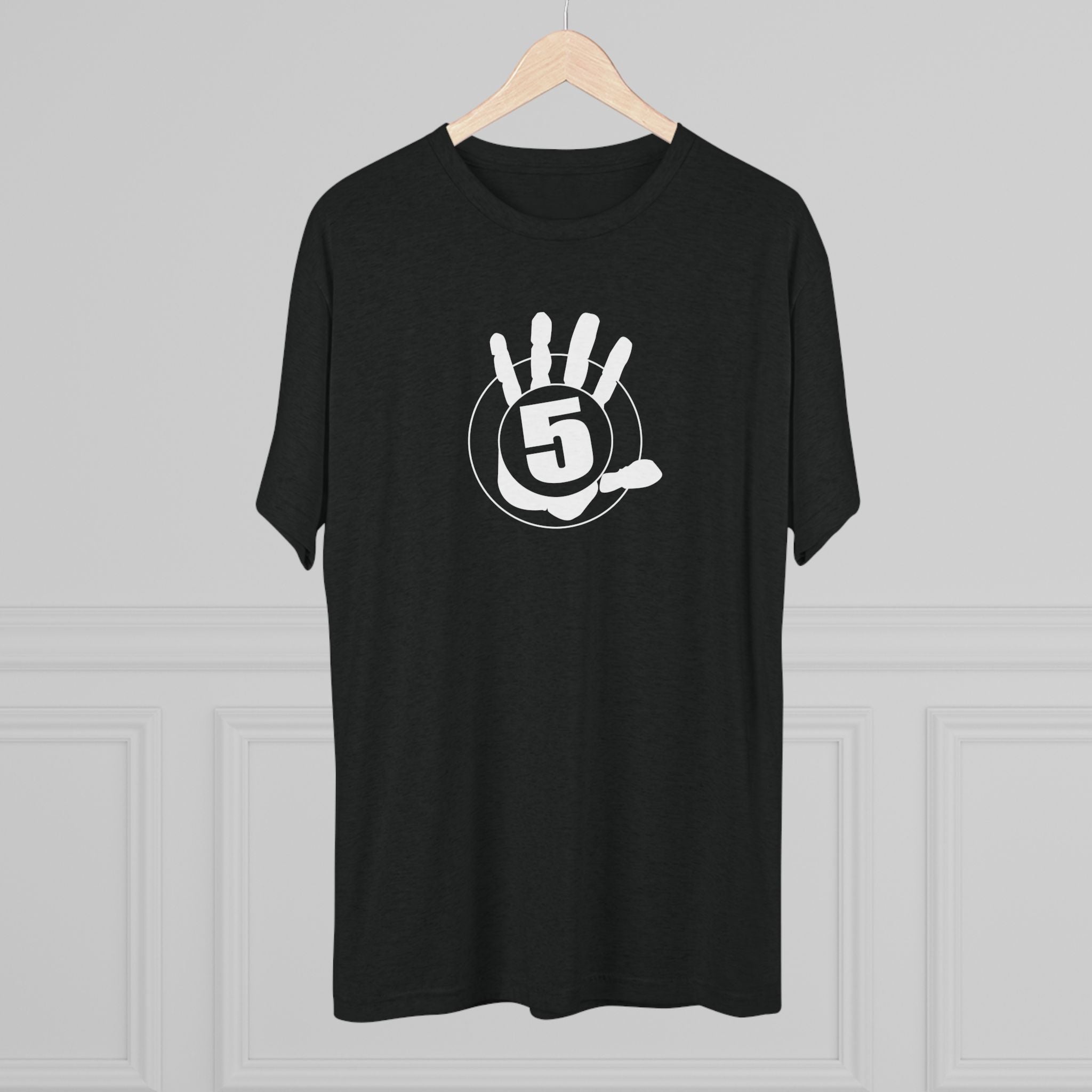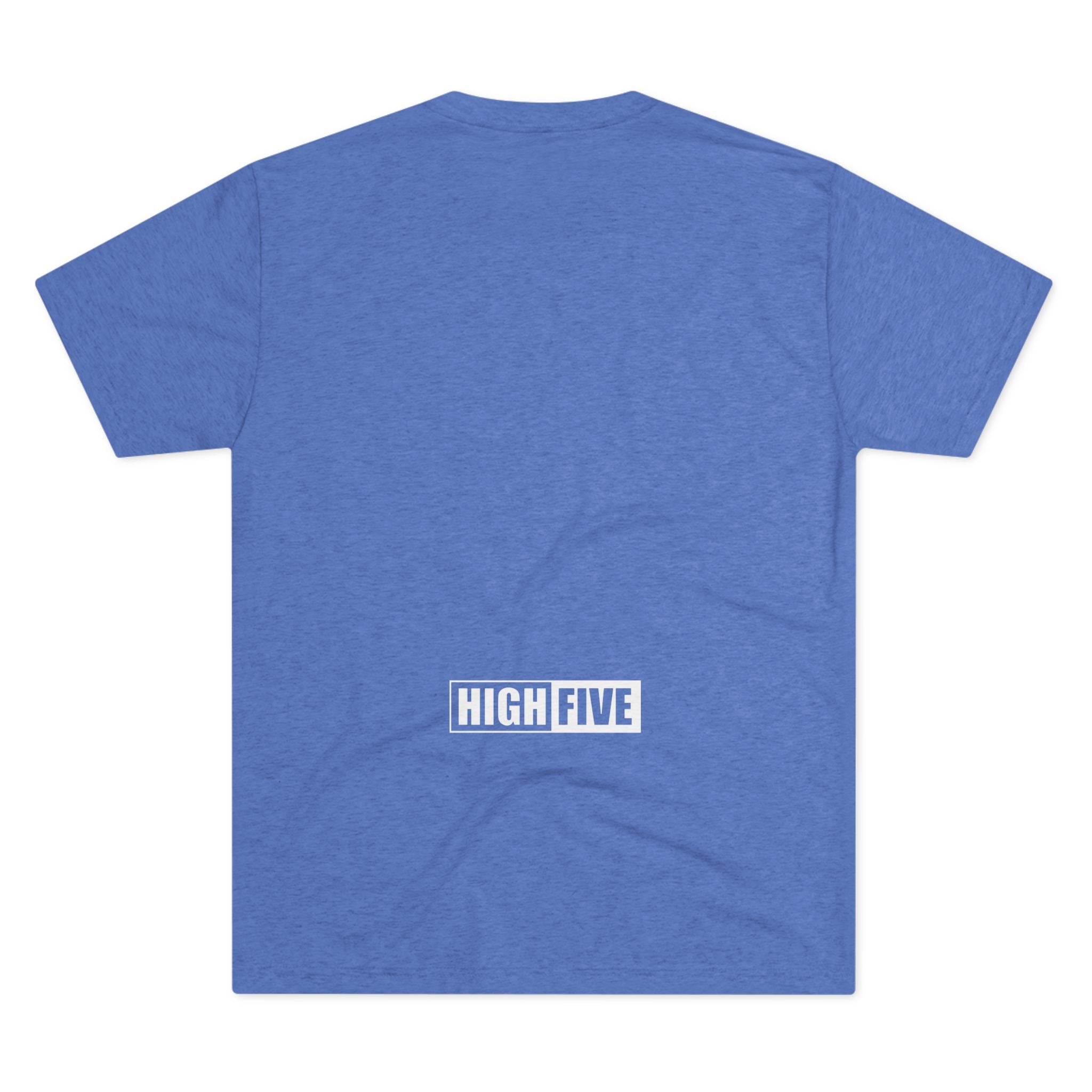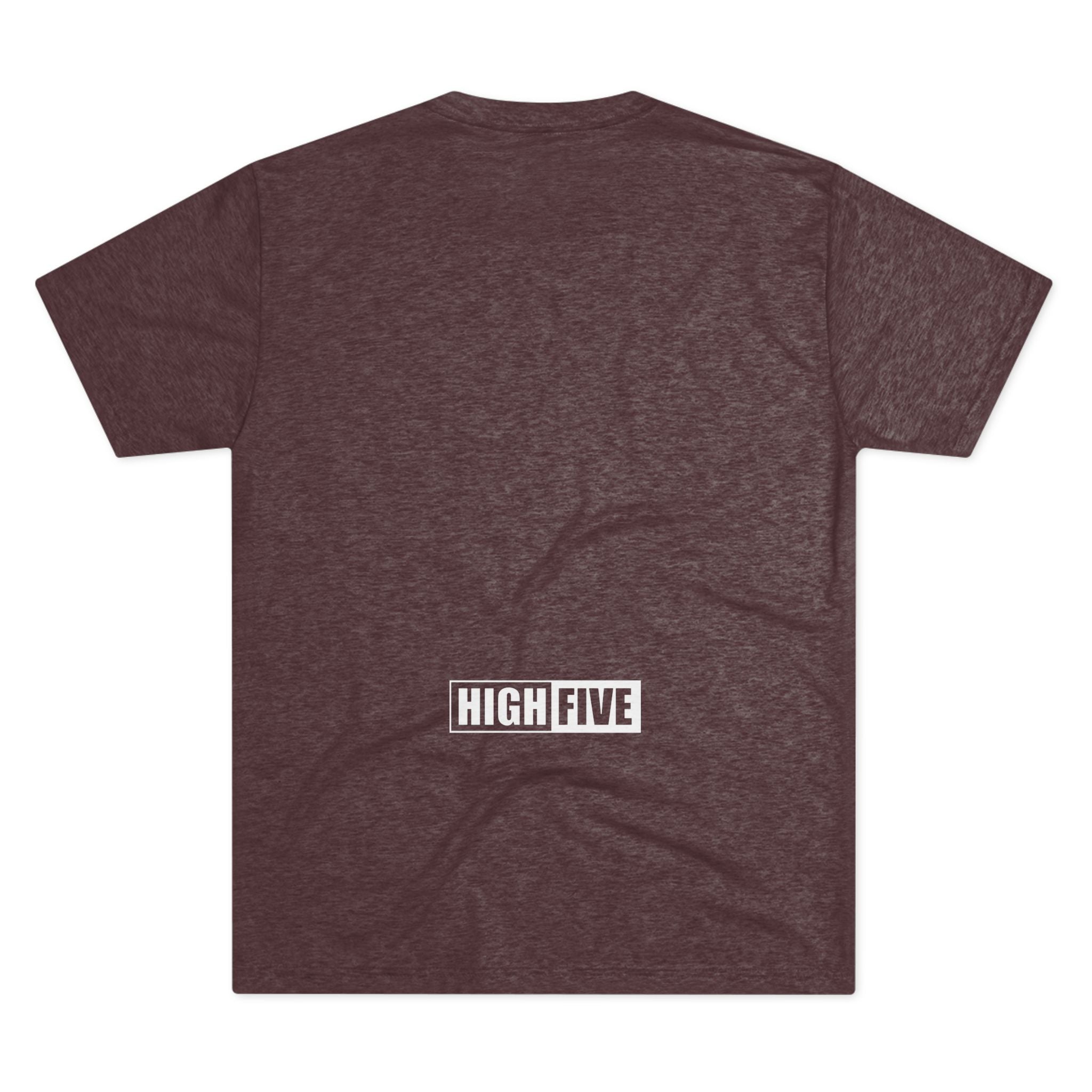 This lightweight crew tee carries a casual, confident energy — soft to the touch and built for everyday motion. A bold white “high five” emblem sits on the chest: an open palm with a centered circular badge and the number 5, clean and graphic. On the lower back a small boxed “HIGH FIVE” stamp adds a playful signature when you turn around. It drapes smoothly thanks to the tri-blend fabric, so it moves with you during quick errands, laid-back meetups, or long practice sessions. Wear it when you want to share a little upbeat attitude without shouting — the design reads friendly and retro-sporty, and the dark heather base keeps the focus on the bright white artwork. Comfortable, breathable, and subtly distinctive, this tee becomes one of those shirts you reach for whenever you want to look relaxed but intentional.