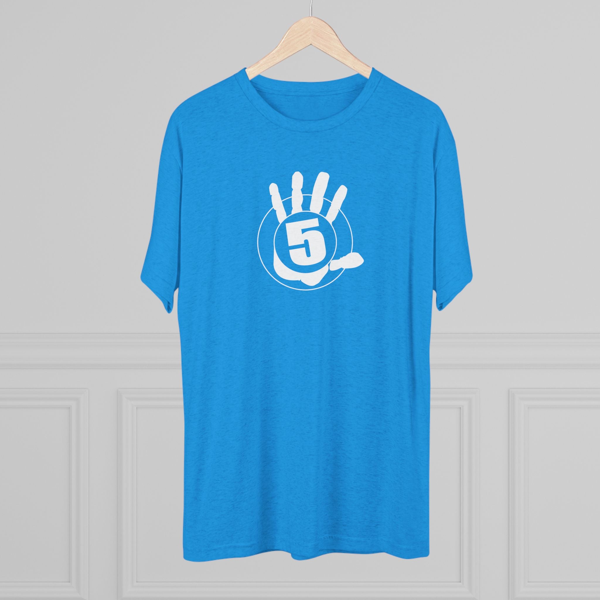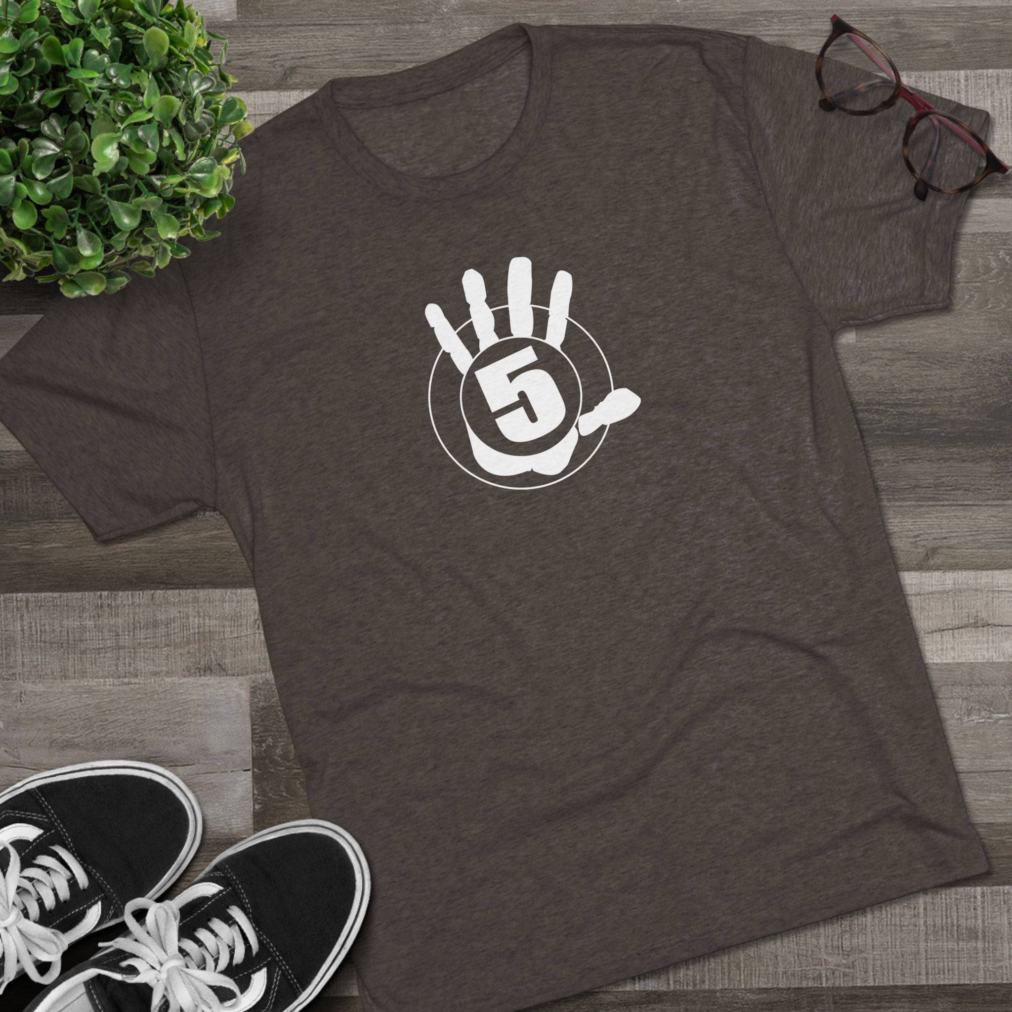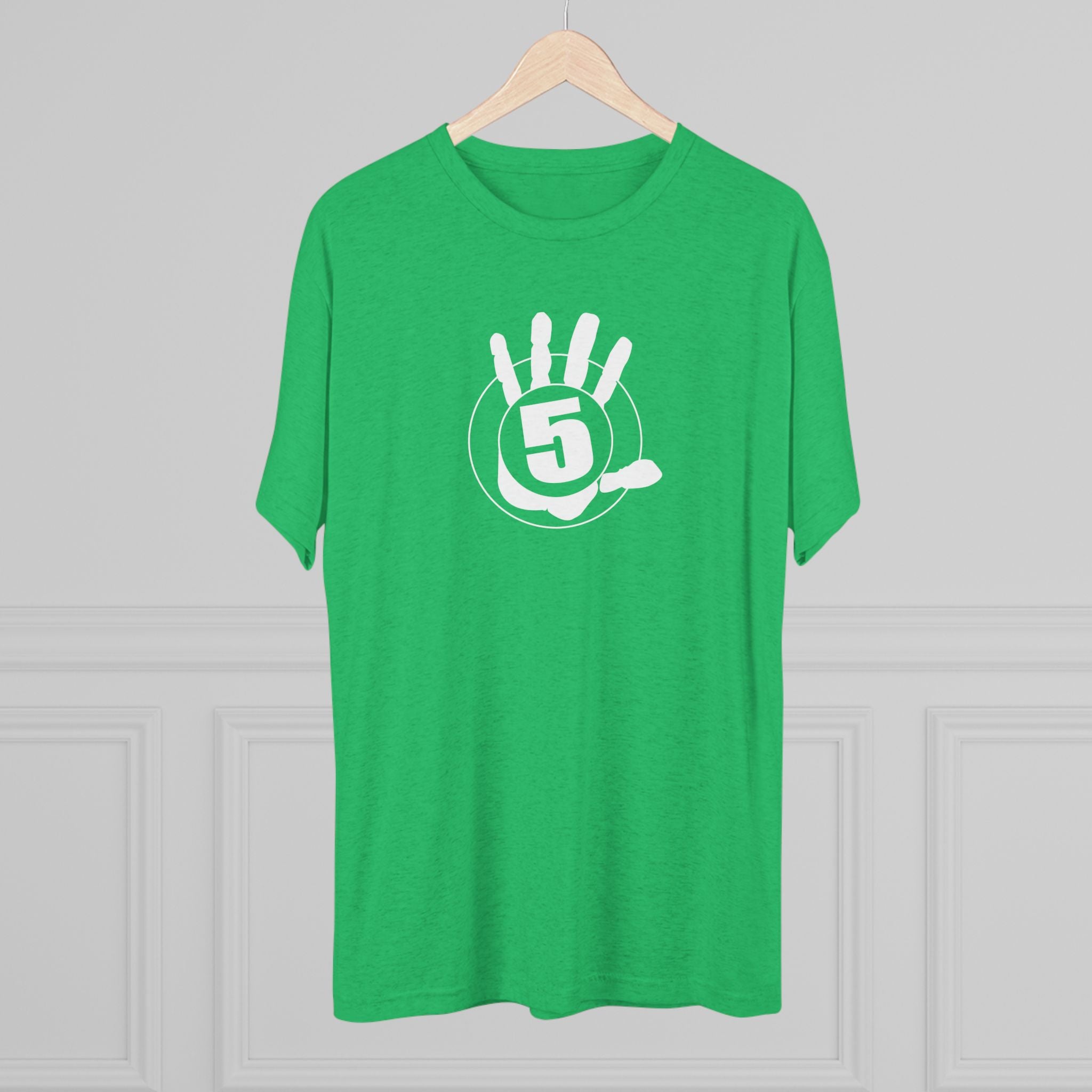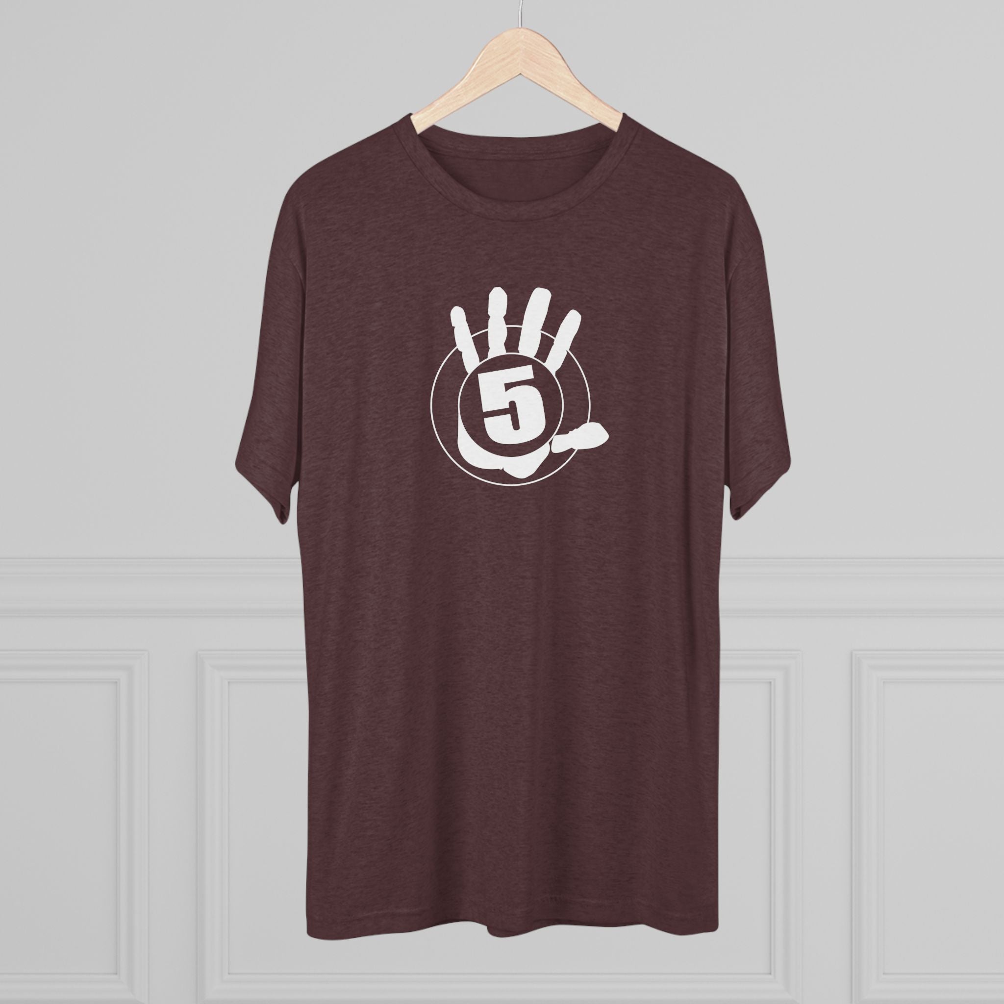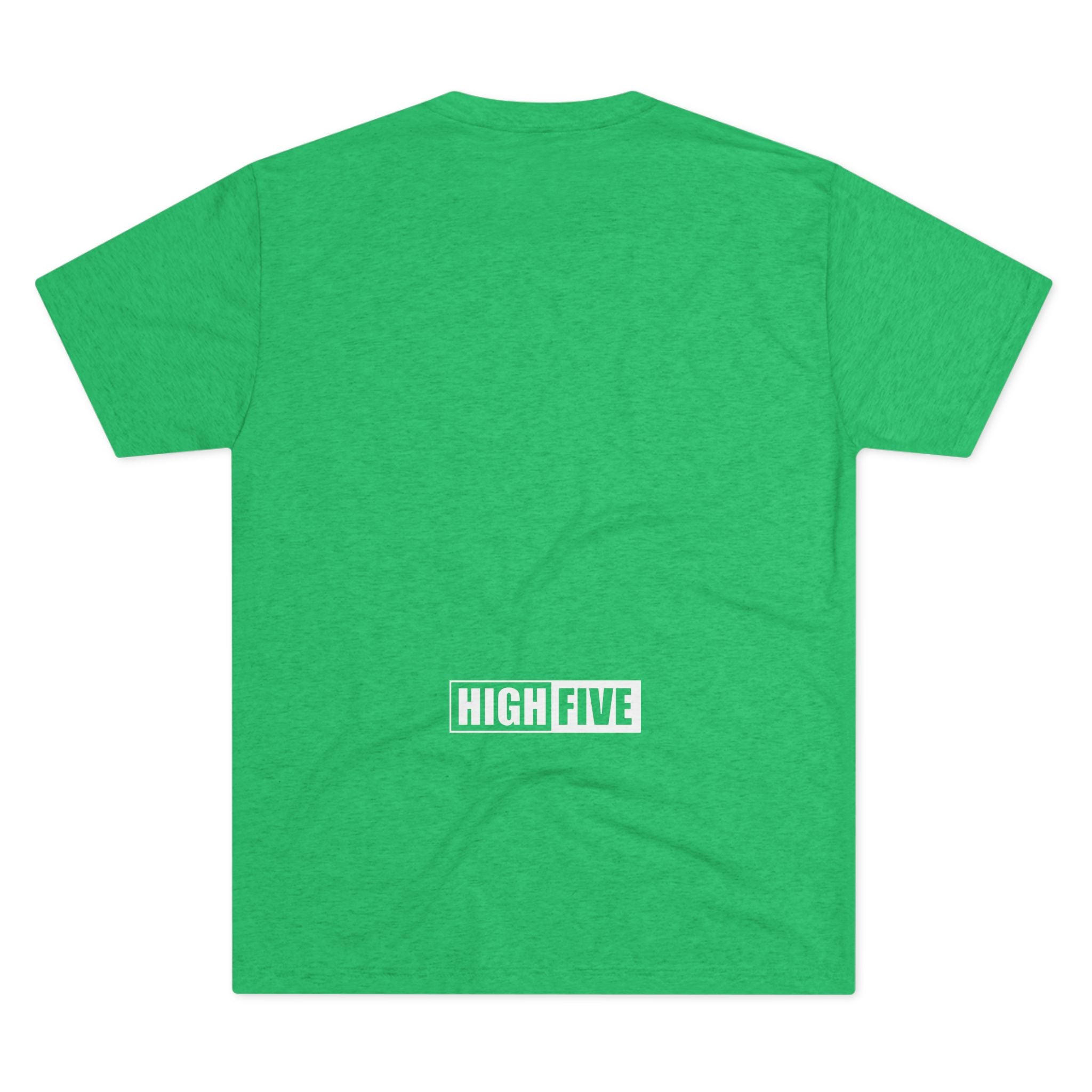 This lightweight crew tee carries a casual, confident energy — soft to the touch and built for everyday motion. A bold white “high five” emblem sits on the chest: an open palm with a centered circular badge and the number 5, clean and graphic. On the lower back a small boxed “HIGH FIVE” stamp adds a playful signature when you turn around. It drapes smoothly thanks to the tri-blend fabric, so it moves with you during quick errands, laid-back meetups, or long practice sessions. Wear it when you want to share a little upbeat attitude without shouting — the design reads friendly and retro-sporty, and the dark heather base keeps the focus on the bright white artwork. Comfortable, breathable, and subtly distinctive, this tee becomes one of those shirts you reach for whenever you want to look relaxed but intentional.